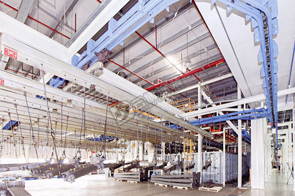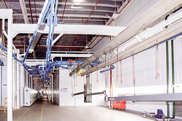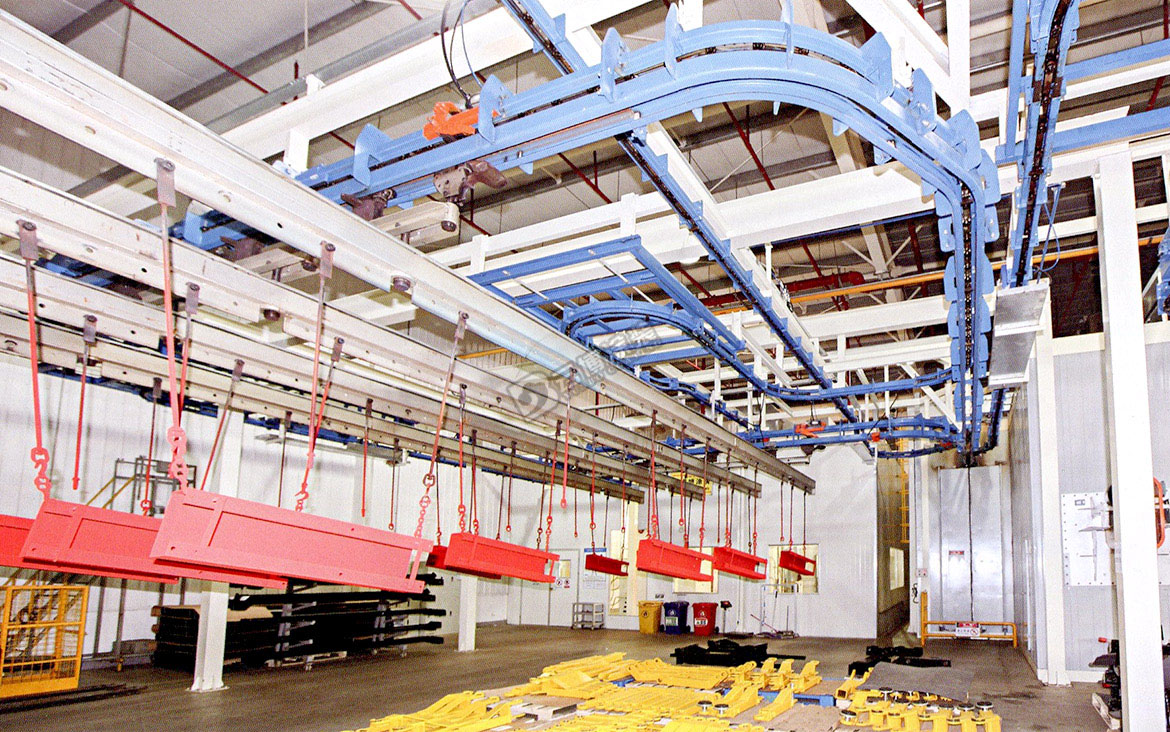 該生產線實現了前處理段的程控行車與輸運線的自動轉掛。自主開發了運載小車自動轉向系統。
